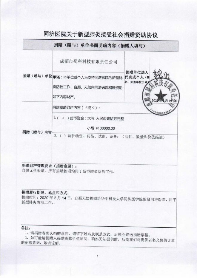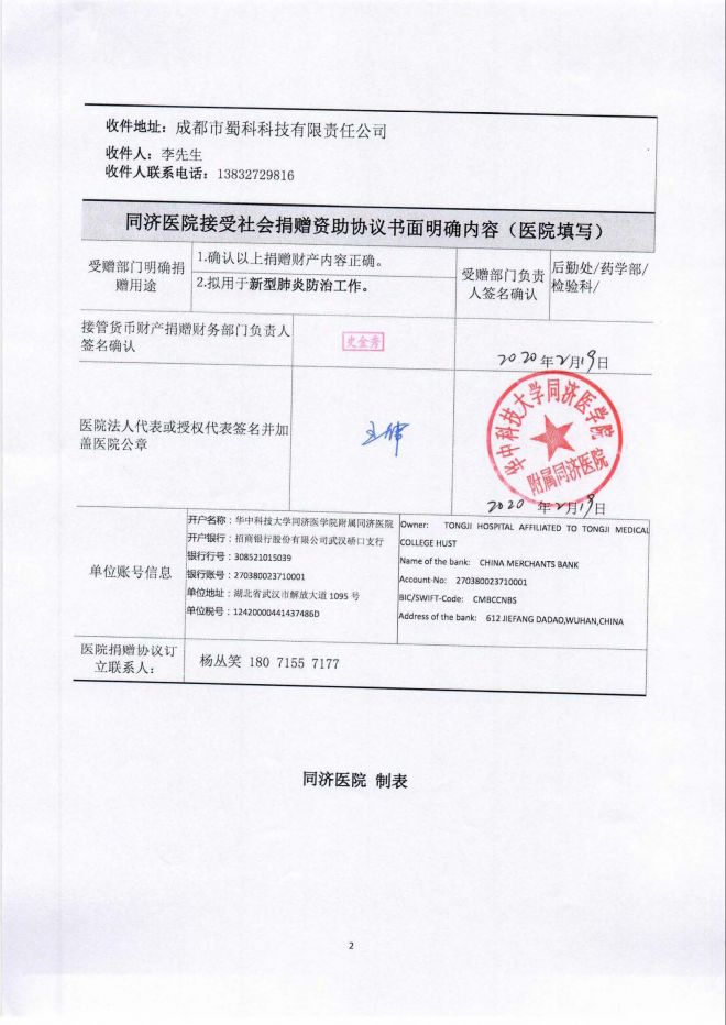2月14日經(jīng)公司定向捐贈給華中科技大學同濟醫(yī)院院附屬同濟醫(yī)院的公司捐款和公司員工的個人捐款已經(jīng)全部由同濟醫(yī)院接收,將全部用于支持新冠肺炎疫情防控工作。